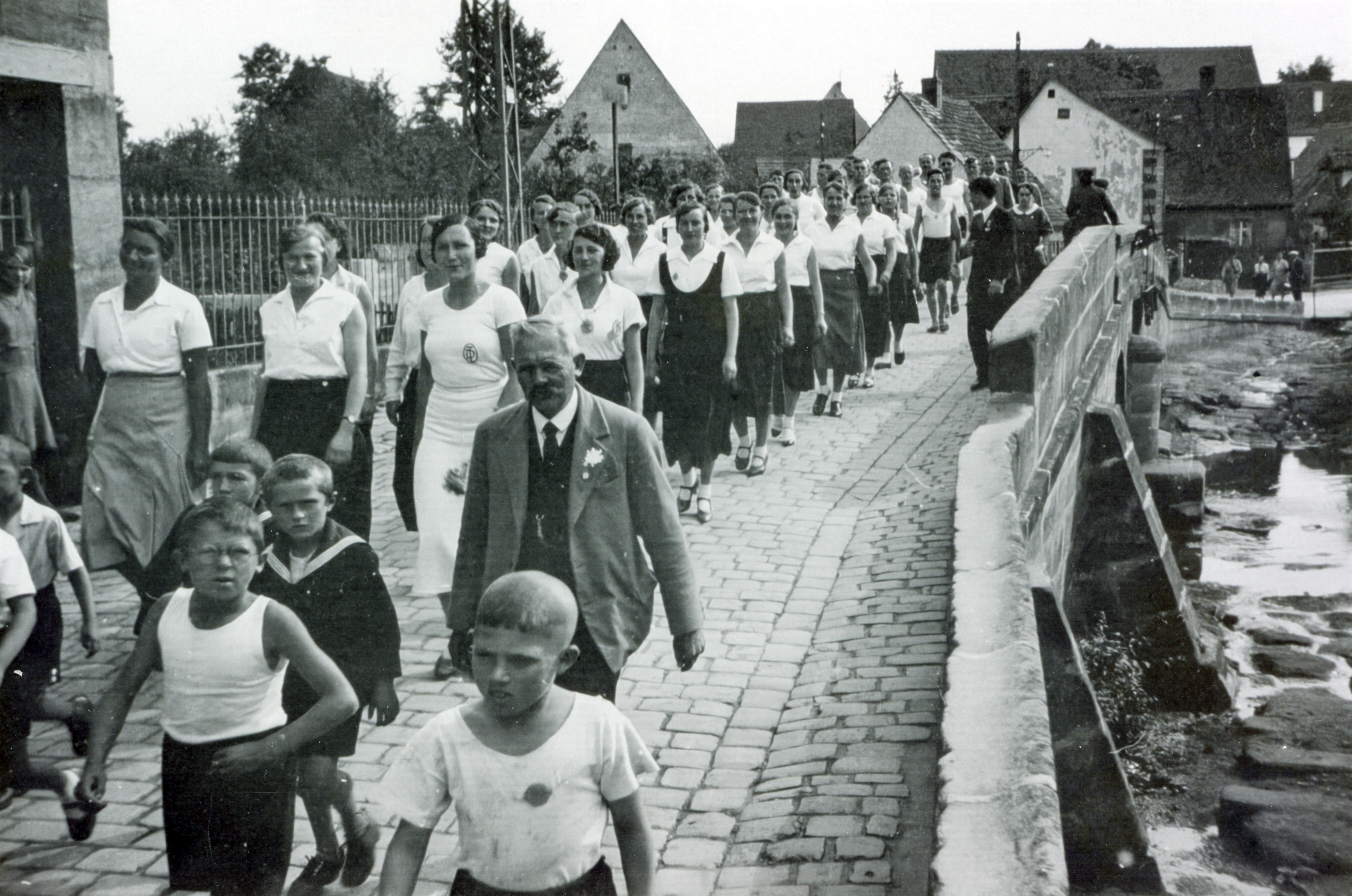 | Beschreibung | Vereinsmarsch auf der Regelsbacher Brücke in Burgfarrnbach, ca. 1920 | ||