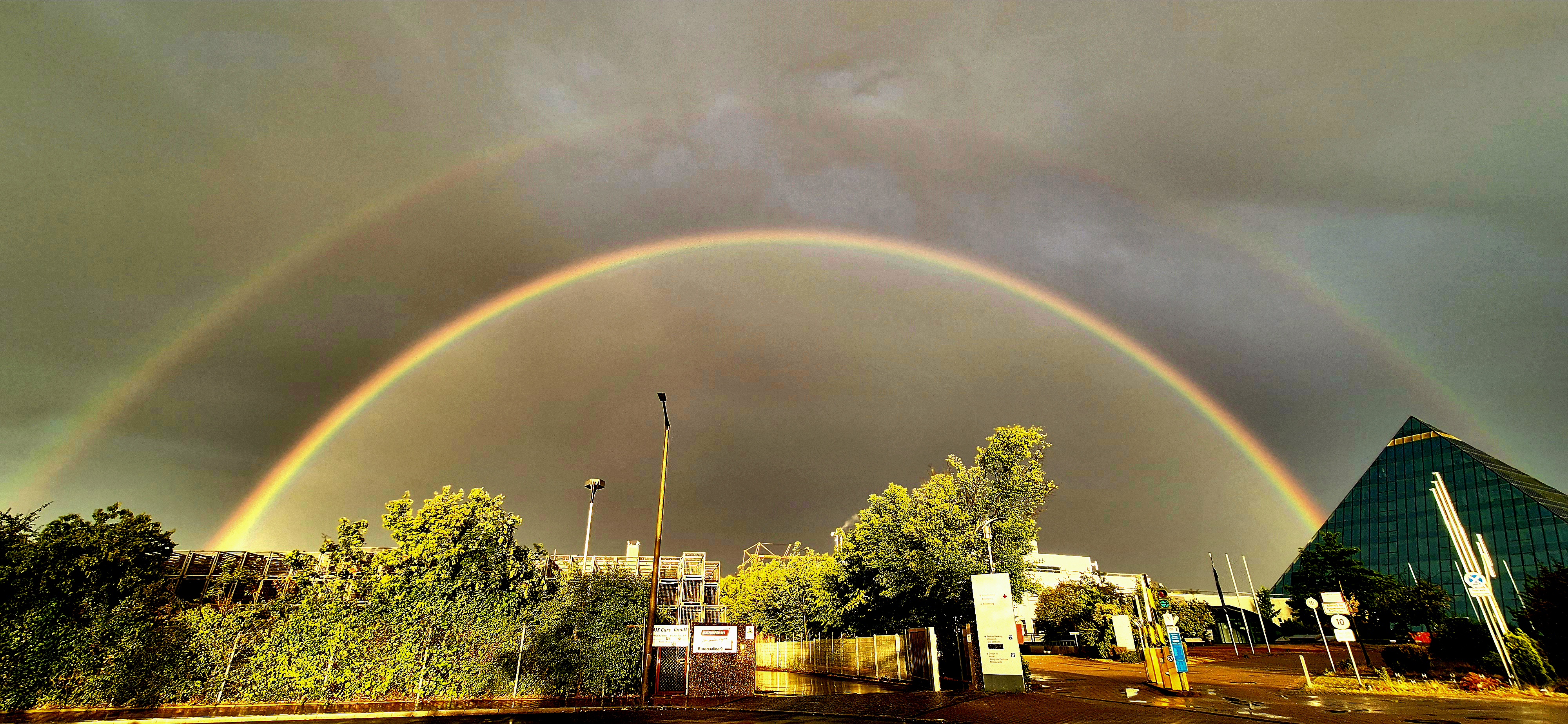 | Beschreibung | Ein während der Schlechtwetterphase am 16.Juli 2025 fotografierter Regenbogen neben dem Hotel-Pyramide. Bildfreigabe liegt vor. | ||