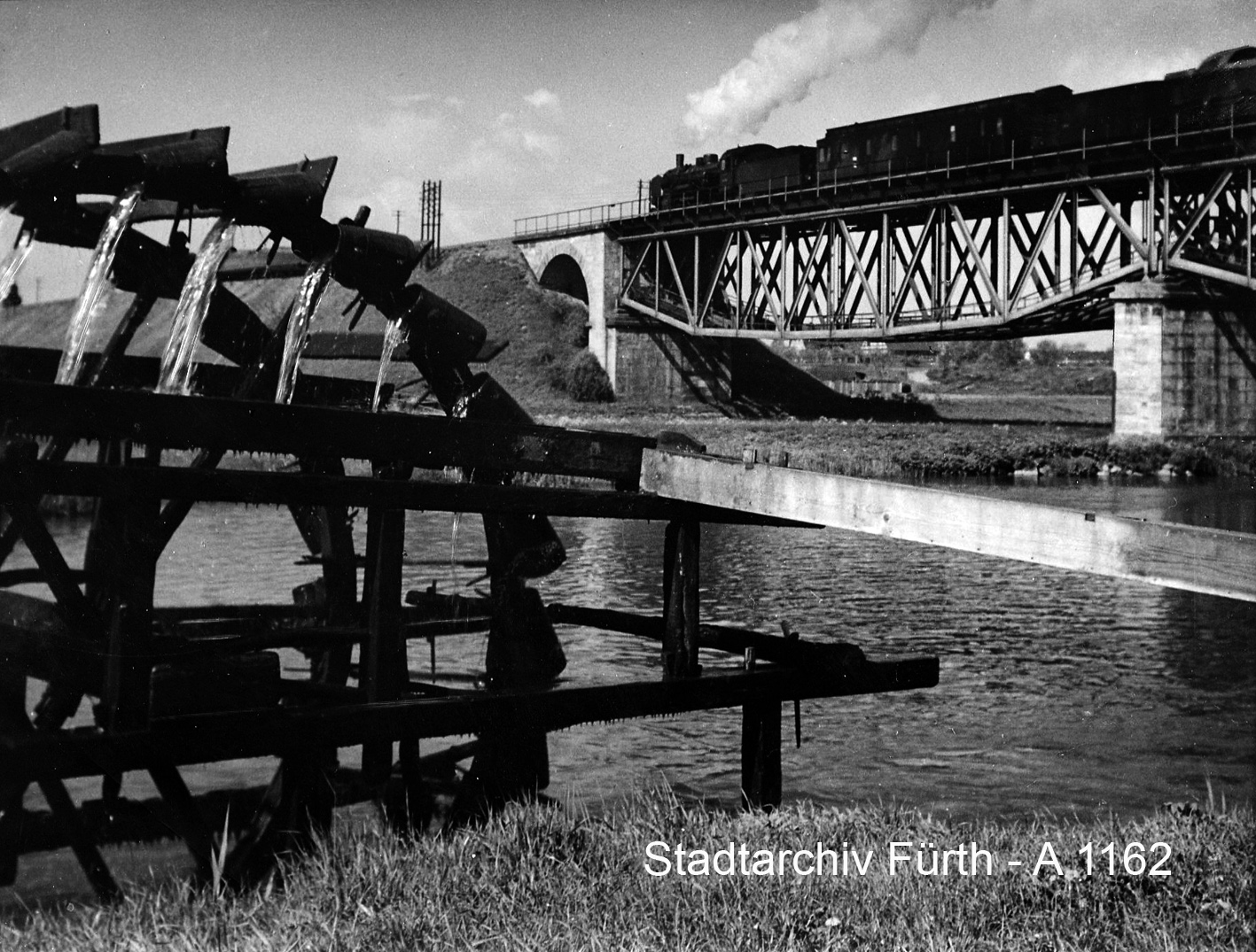 | Dateiinfo (Bild-Unterschrift und Info-Box, automatisch erstellt) | Die Regnitztalbrücke im Wiesengrund im Jahre 1935 mit Wasserschöpfrad Lizenz: Bildlizenz-Stadtarchiv | ||