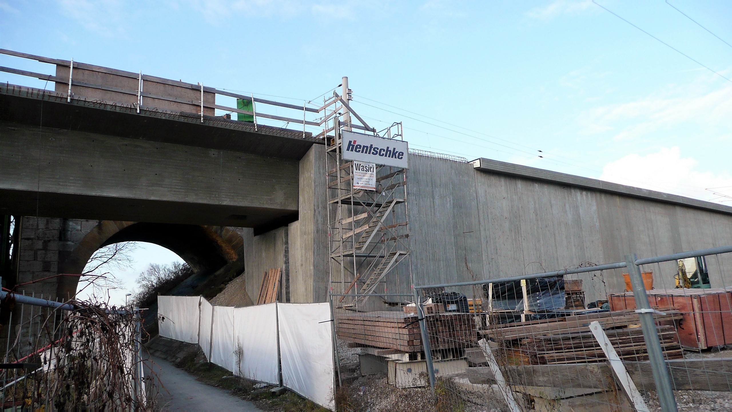 2013: Regnitztalbrücke Stadeln mit neuen Brückenanbau im Vordergrund für die S-Bahn, Detail Widerlager östliche Seite