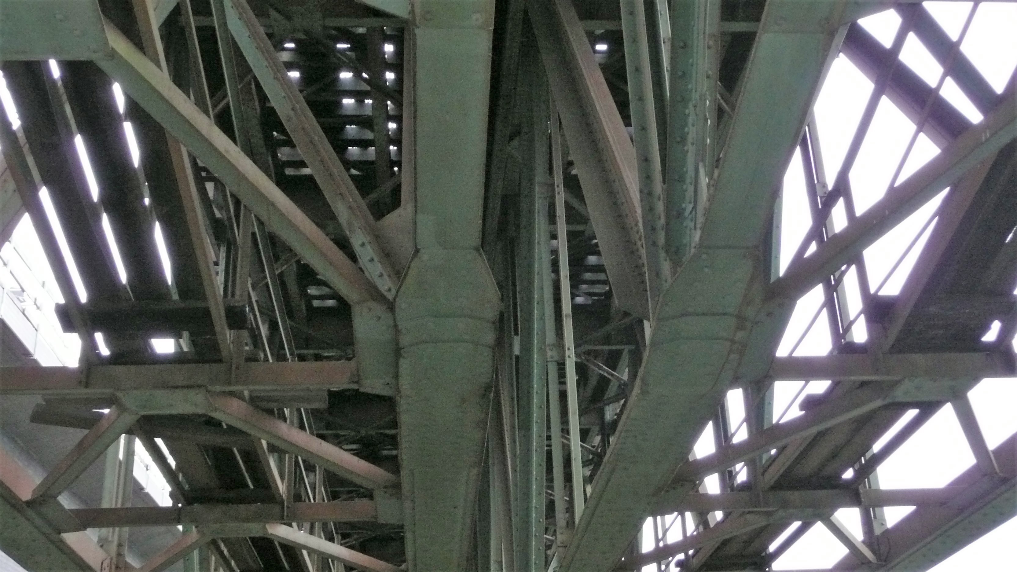 2013: Detail der Fischbauch Regnitztalbrücke Stadeln erbaut 1875-1876. Links Teil der neuen S-Bahn Spannbetonbrücke.