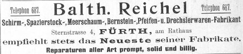| Dateiinfo (Bild-Unterschrift und Info-Box, automatisch erstellt) | Werbeanzeige Balth. Reichel, August 1900 Lizenz: CC BY-NC-SA 4.0 | ||
