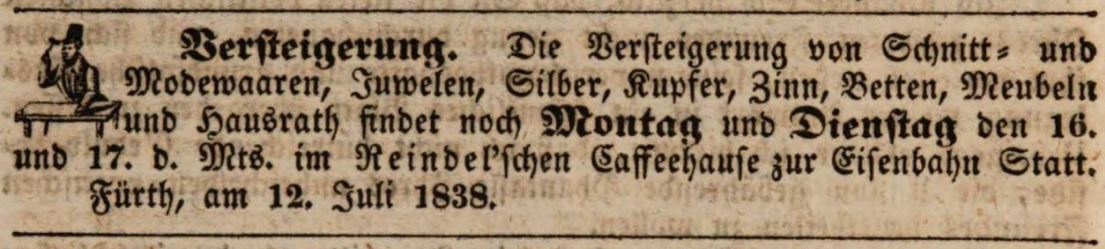 | Beschreibung | Anzeige einer Versteigerung im "Reindel'schen Caffeehause zur Eisenbahn, Juli 1838 | ||