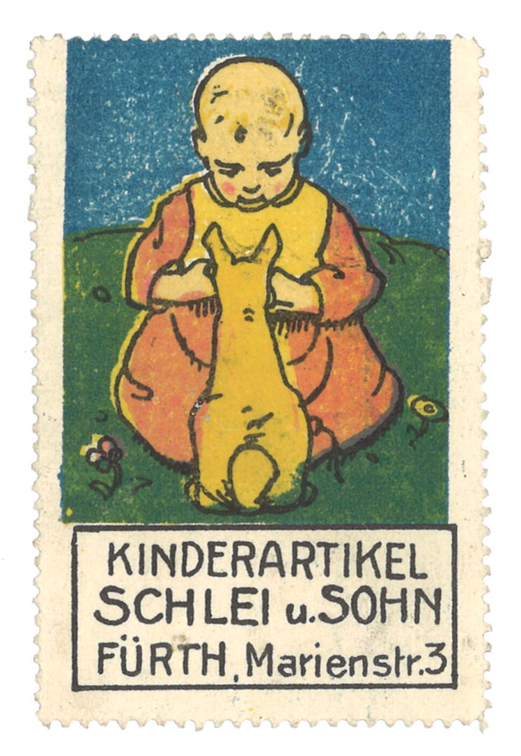 | Dateiinfo (Bild-Unterschrift und Info-Box, automatisch erstellt) | Historische Reklamemarke der Fa. Schlei u. Sohn Kinderartikel Lizenz: CC BY-SA 3.0 | ||