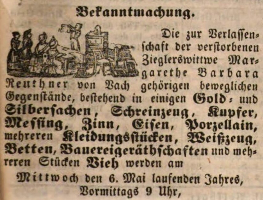 | Dateiinfo (Bild-Unterschrift und Info-Box, automatisch erstellt) | Erbsache der verstorbenen "Zieglerswittwe Margarethe Barbara Reuthner" in Vach, April 1846 Lizenz: NoC-NC 1.0 | ||
