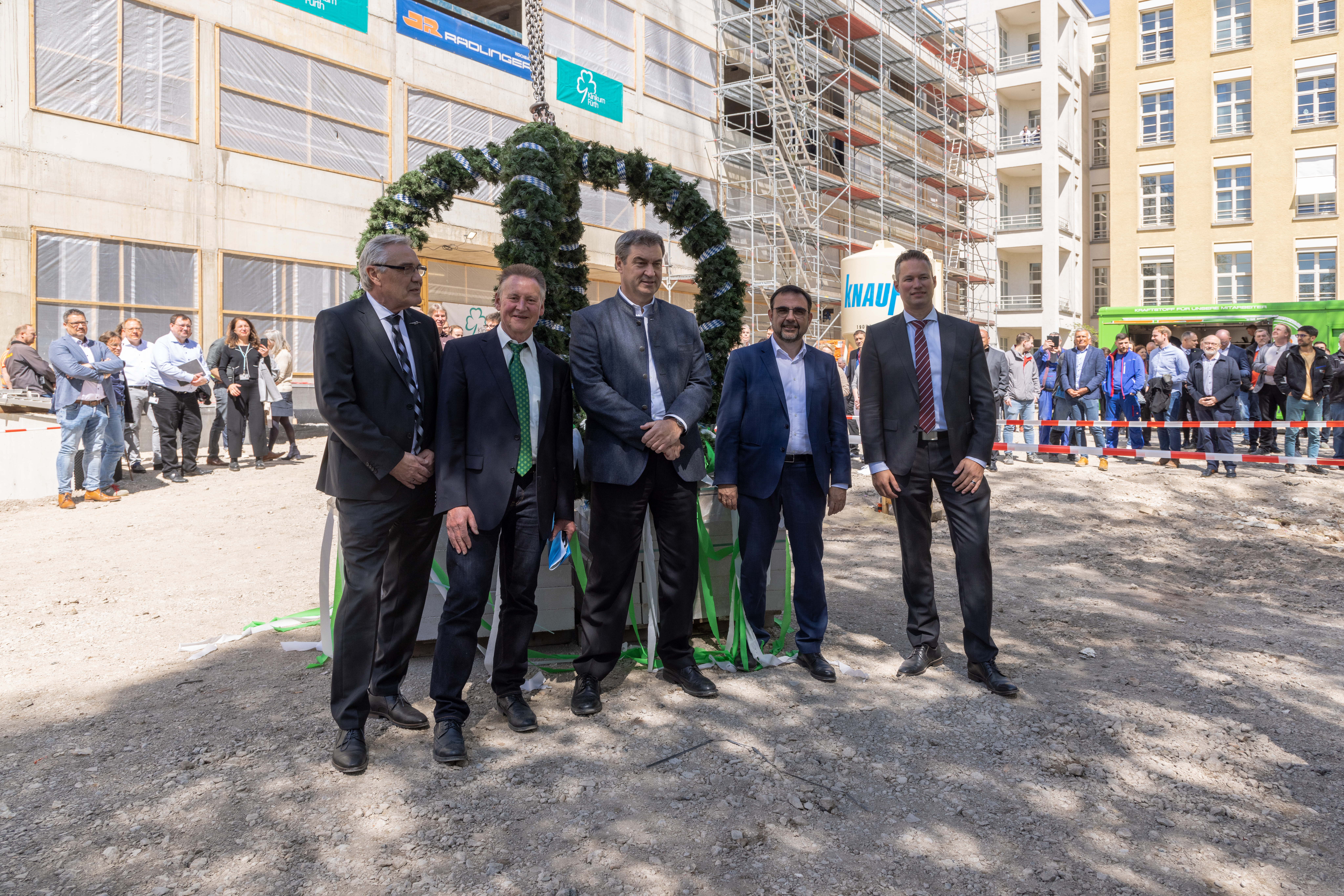 | Beschreibung | Richtfest am Neubau des Klinikum Fürth (v.l.n.r.): Peter Krappmann, OB Thomas Jung, Dr. Markus Söder, Klaus Holetschek und Alexander Mohr | ||