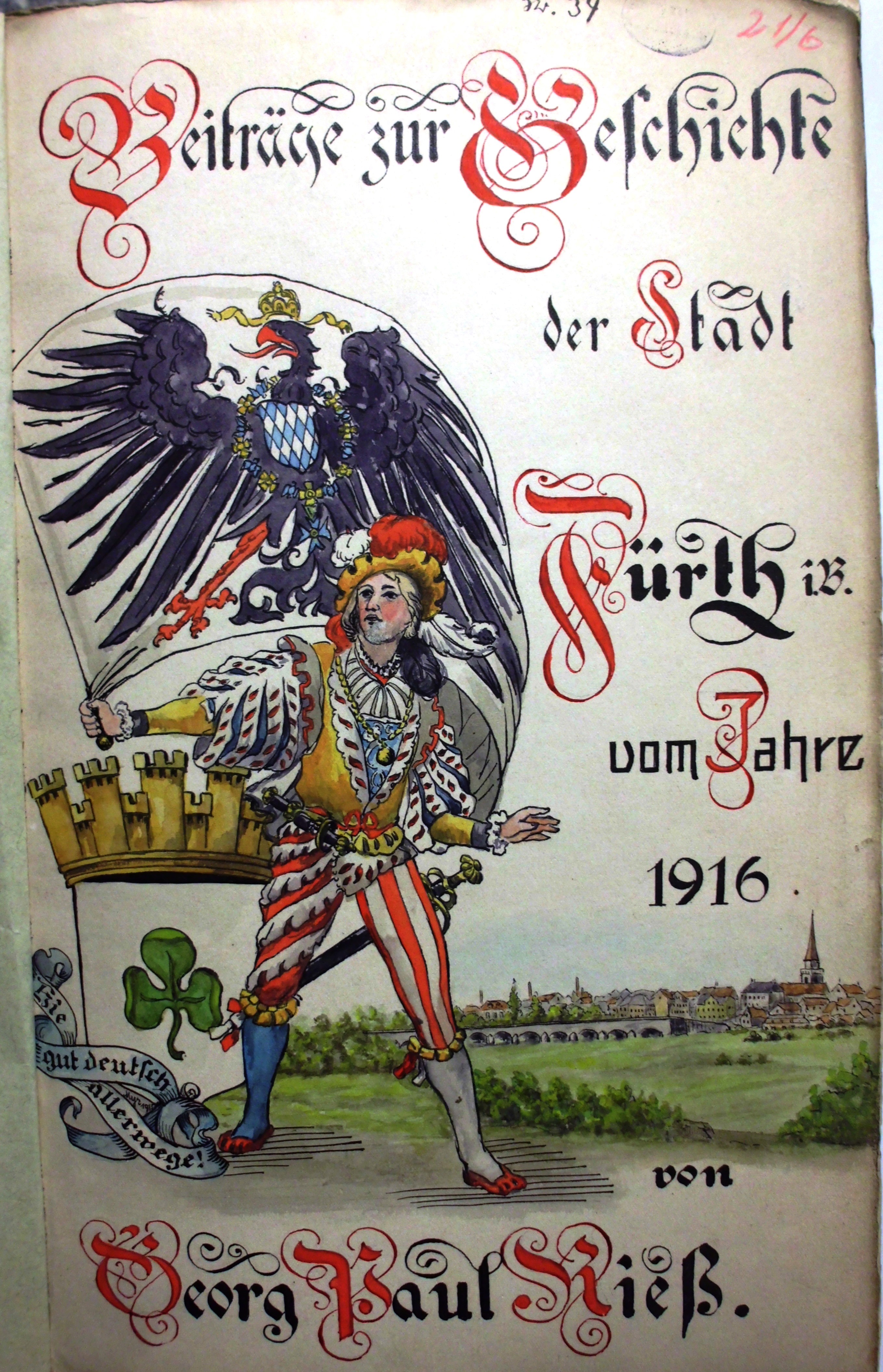 | Dateiinfo (Bild-Unterschrift und Info-Box, automatisch erstellt) | Titelbild des Chronikbandes von Paul Rieß 1916 Urheber: Frank, Peter<br><br>Lizenz: Bildlizenz-Stadtarchiv | ||