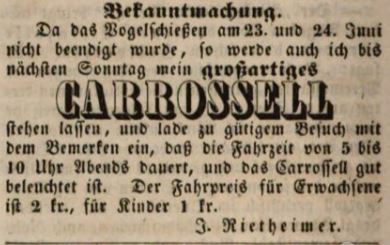 | Beschreibung | Werbeanzeige von J. Rietheimer für sein "CARROSSELL" bei der Schießhauskirchweih, Juni 1844 | ||
