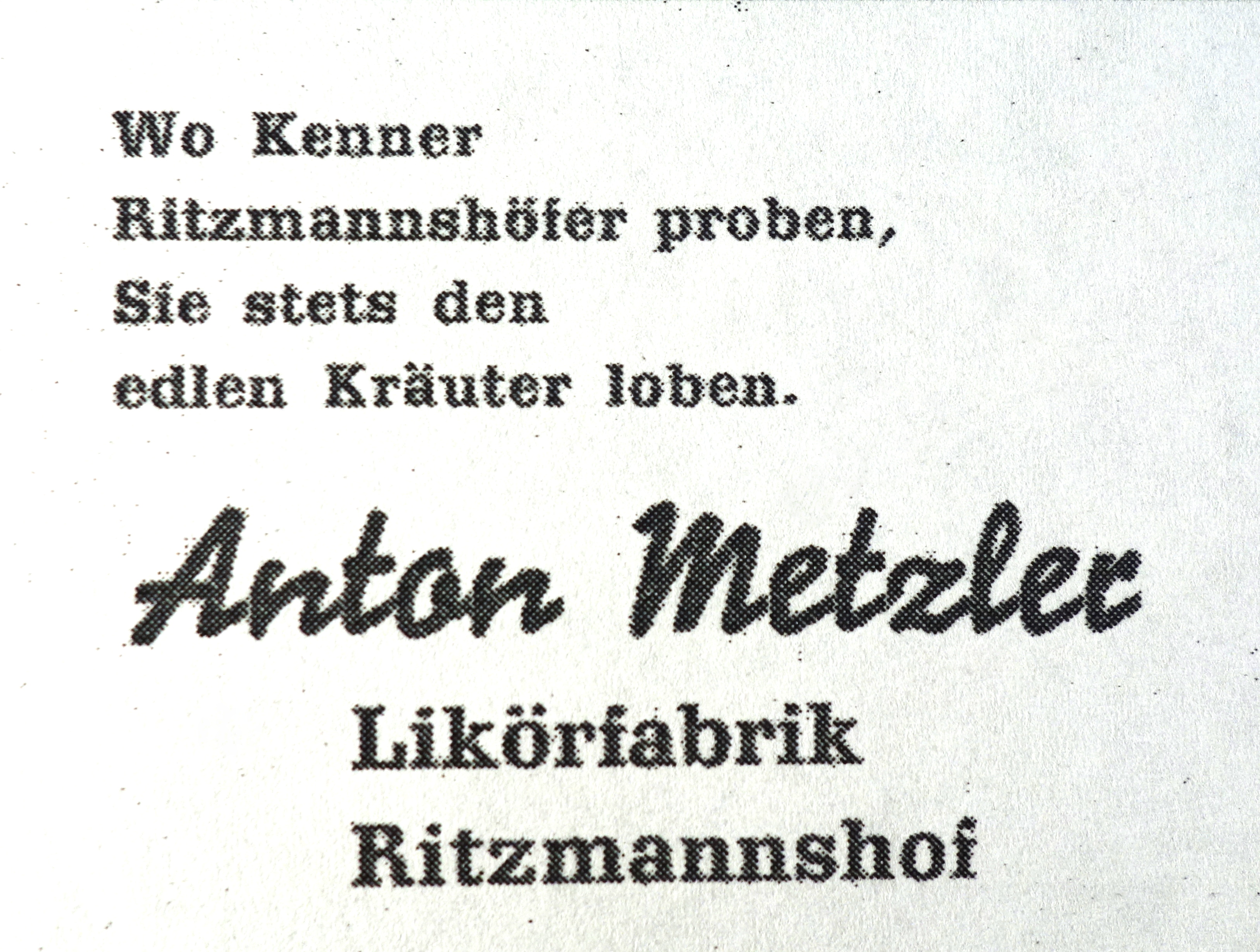 | Dateiinfo (Bild-Unterschrift und Info-Box, automatisch erstellt) | Werbeanzeige der Ritzmannshöfer Likörfabrik Metzler von 1958 Lizenz: CC BY-SA 4.0 | ||