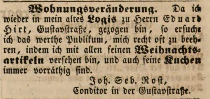 | Beschreibung | Umzug des Conditors Johann Sebastian Rost in die Gustavstraße, November 1849 | ||