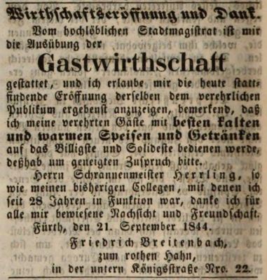 | Beschreibung | Zeitungsannonce von Friedrich Breitenbach zur Eröffnung seiner Wirtschaft zum rothen Hahn, September 1844 | ||