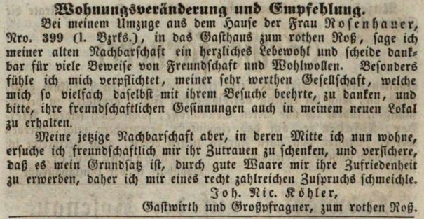 | Dateiinfo (Bild-Unterschrift und Info-Box, automatisch erstellt) | Zeitungsannonce von Joh. Nic. Köhler, Gastwirth "zum rothen Roß", August 1843 Lizenz: NoC-NC 1.0 | ||