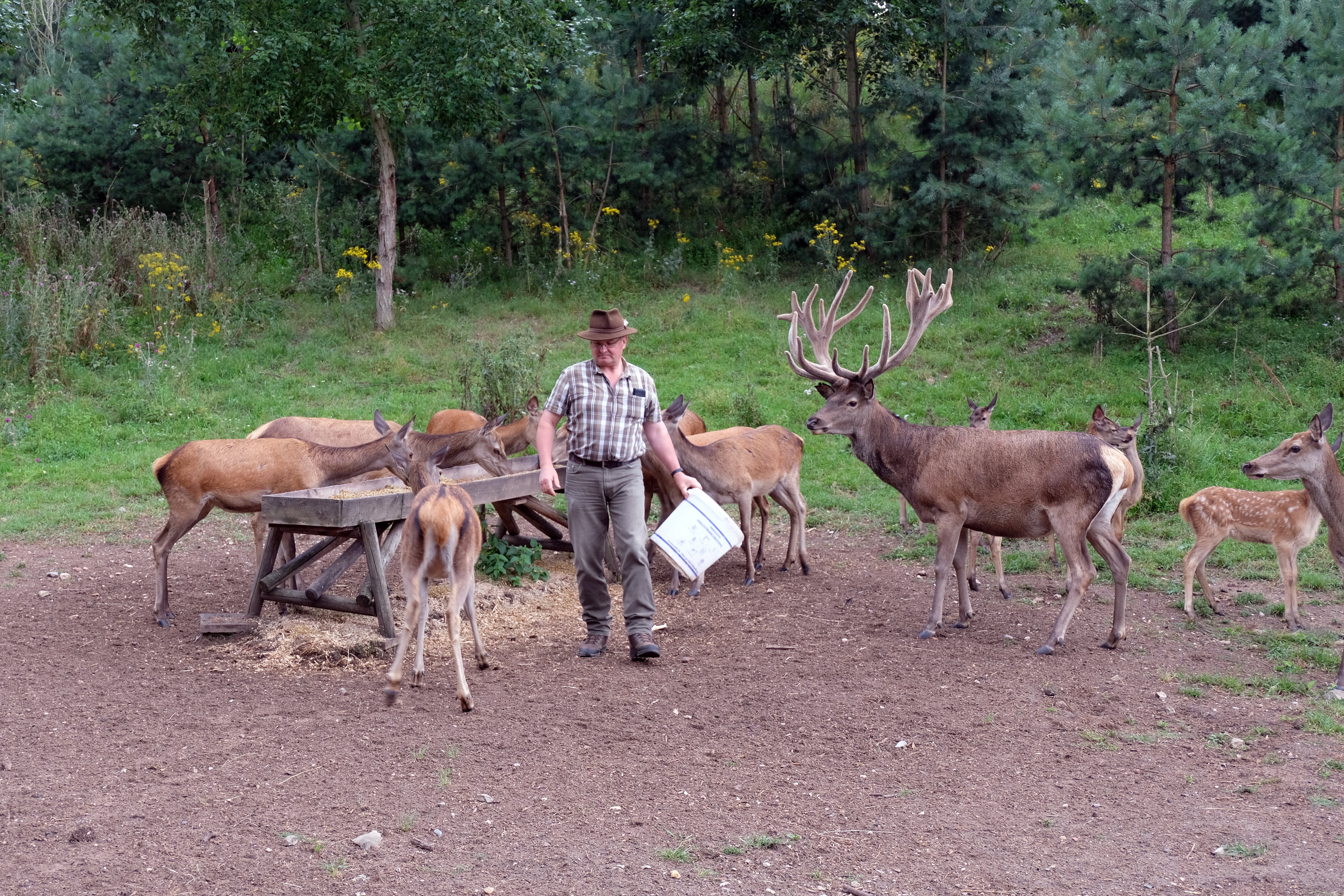 | Beschreibung | Rotwild bei der Fütterung durch den Stadtförster Martin Straußberger im Rotwildgehege im Stadtwald, Aug. 2021 | ||