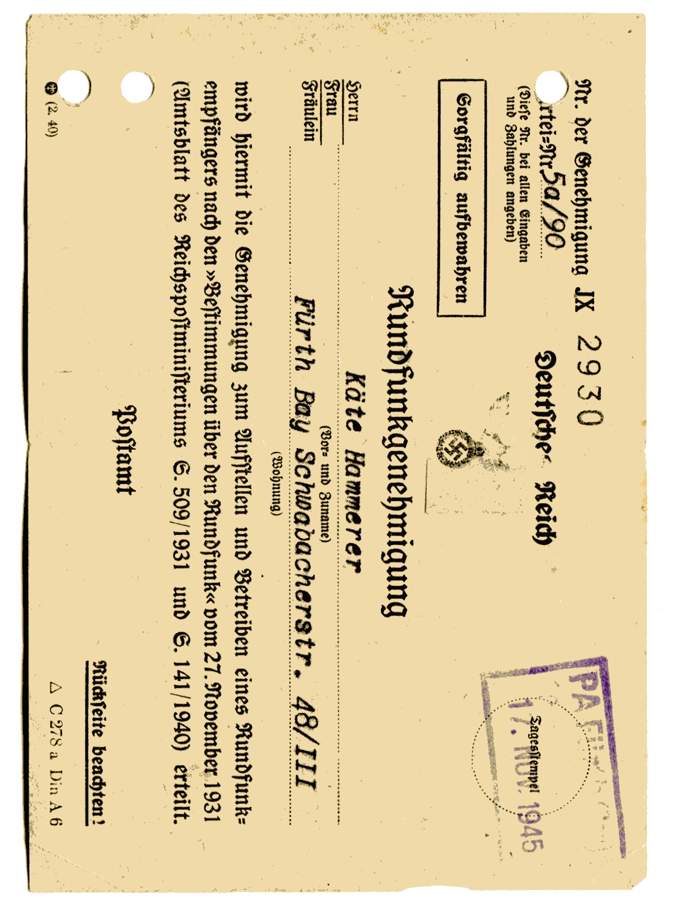 | aktuell | 17:57, 16. Dez. 2018 | 1.791 × 1.348 (845 KB) | Nobbi48 (Diskussion | Beiträge) | Rundfunk Genehmigung vom November 1945. Der Pleitegeier wurde nur dürftig etwas abgeklebt. 2 RM pro Monat, nicht billig... |