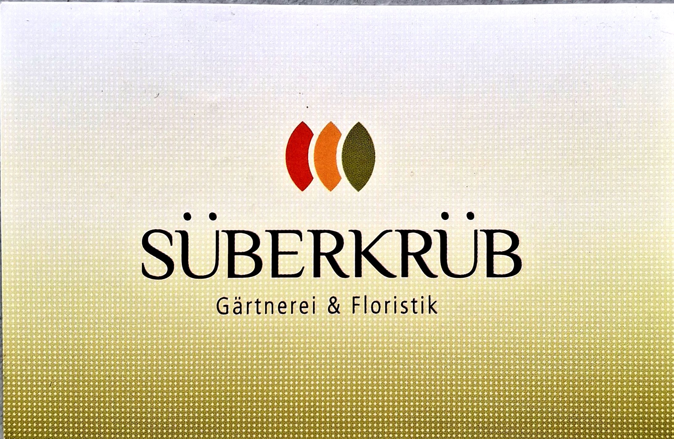 | Dateiinfo (Bild-Unterschrift und Info-Box, automatisch erstellt) | Visitenkarte vorne Urheber: Gärtnerei Süberkrüb<br><br>Lizenz: CC BY-SA 3.0 | ||