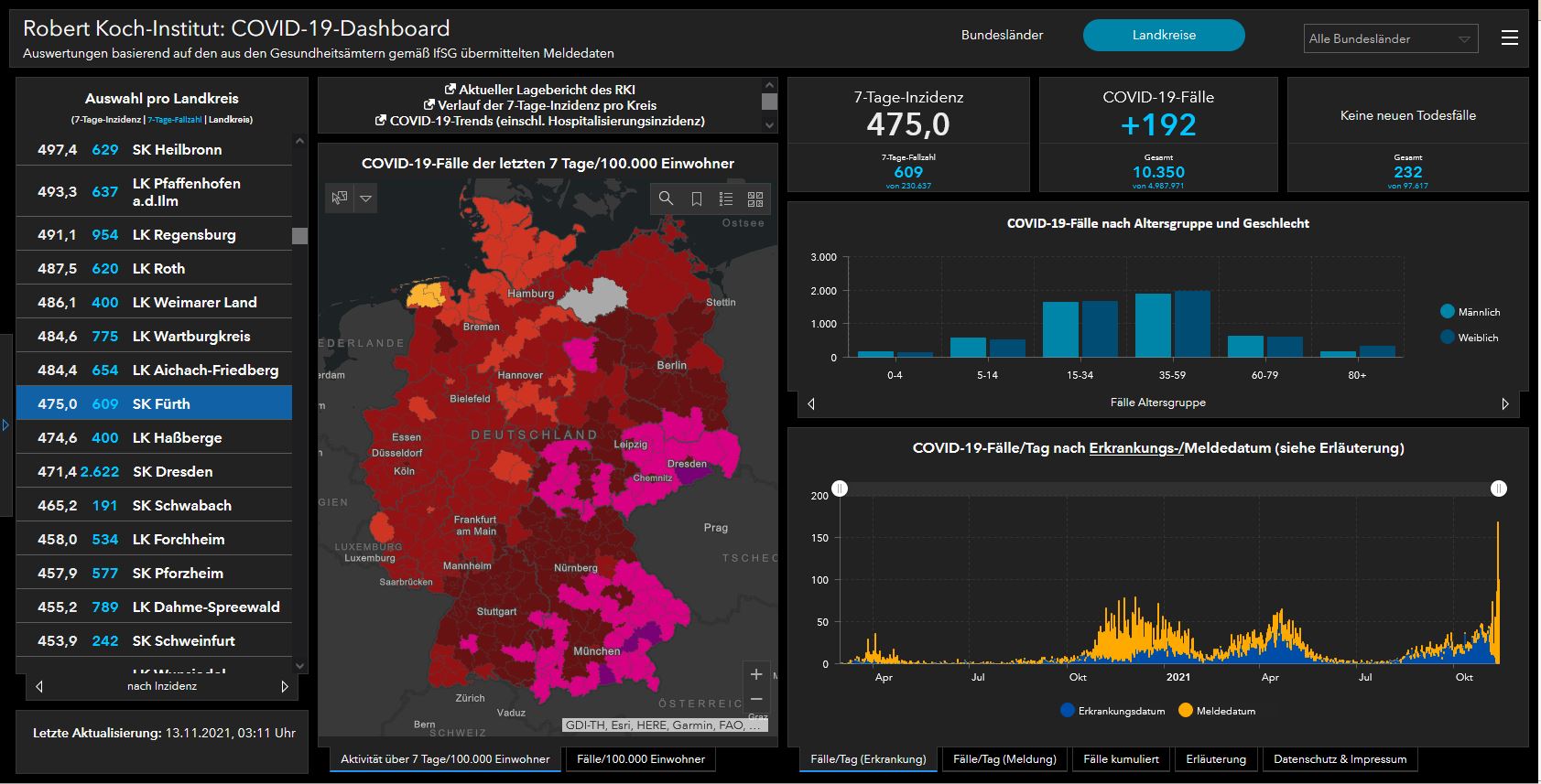 | Beschreibung | Der COVID-19-Dashboard des Robert-Koch-Instituts - hier ein Screenshot mit den tagesaktuellen Fällen aus der Kreisfreien Stadt Fürth, 13. November 2021 | ||