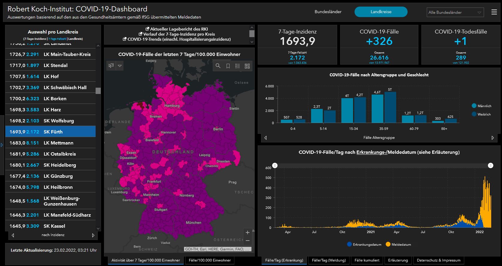 | Beschreibung | Der COVID-19-Dashboard des Robert-Koch-Instituts - hier ein Screenshot mit den tagesaktuellen Fällen aus der Kreisfreien Stadt Fürth - die sog. Omikron-Welle hatte Deutschland ihren Höhepunkt erreicht, 23. Feb. 2022 | ||