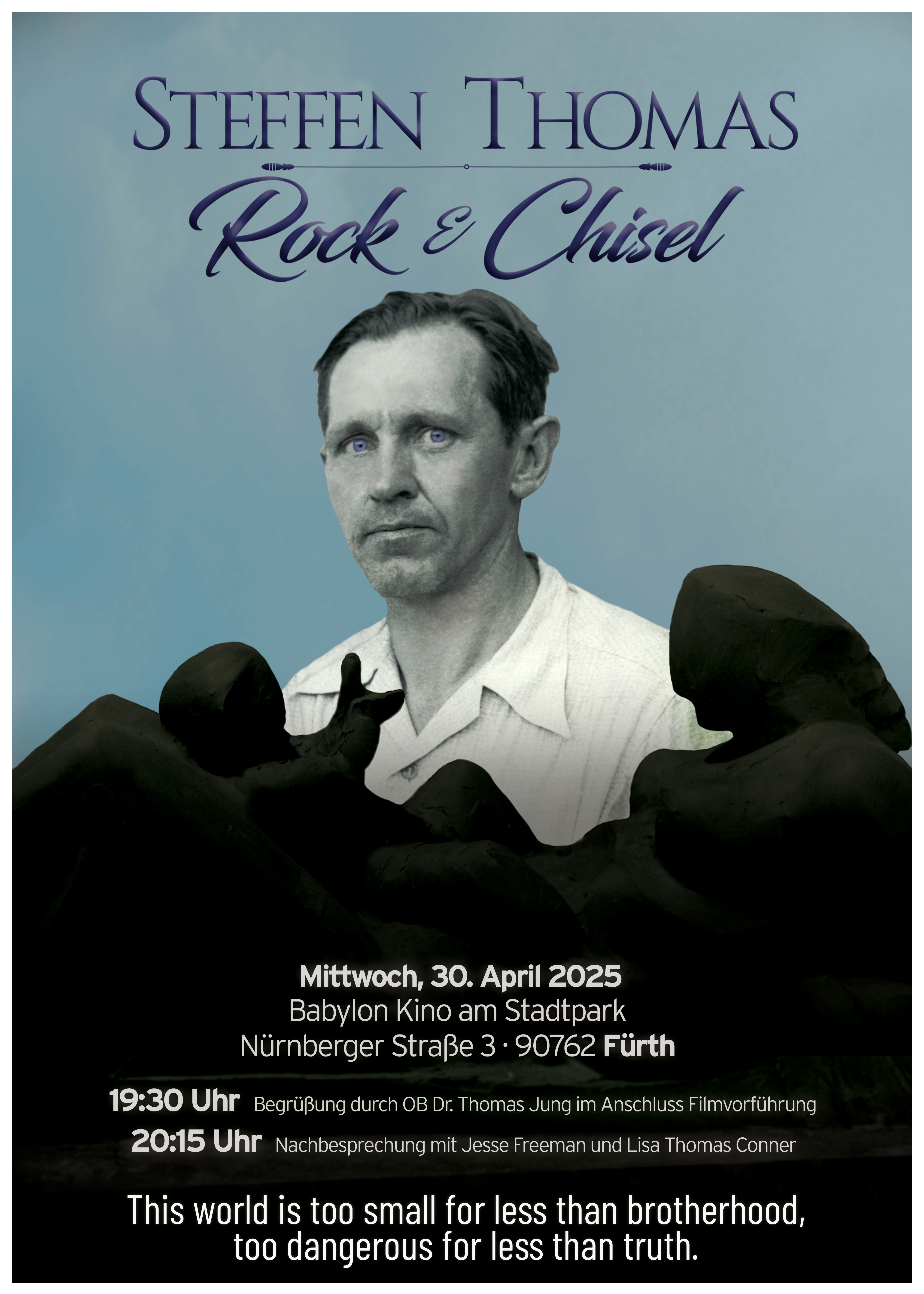 | Dateiinfo (Bild-Unterschrift und Info-Box, automatisch erstellt) | Veranstaltungsposter für die Filmvorführung über das Leben von Steffen Thomas im Babylon Kino, April ... Veranstaltungsposter für die Filmvorführung über das Leben von Steffen Thomas im Babylon Kino, April 2025<br>Urheber: Stadt Fürth /<br><br>Lizenz: copyright | ||
