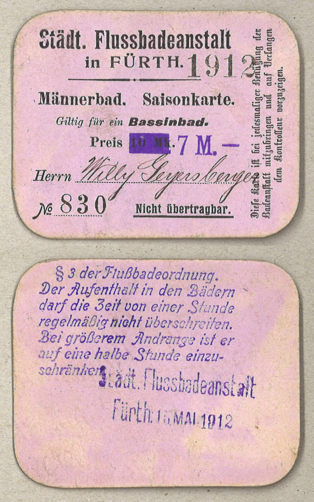 | Beschreibung | Saisonkarte Flussbad für Männer, 1912. Ausgestellt auf Willy Geyersberger, Städt. Oberassessor, wohnhaft Marienstr. 41 | ||