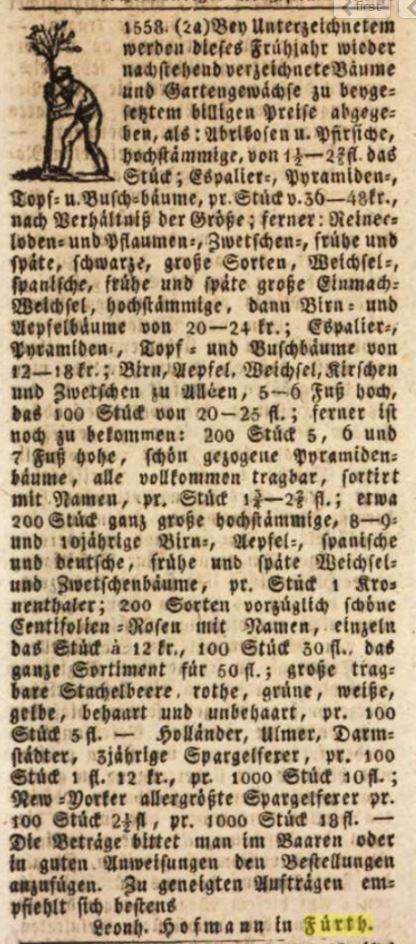 | Beschreibung | Werbeannonce der Gärtnerei Hofmann, März 1836 | ||