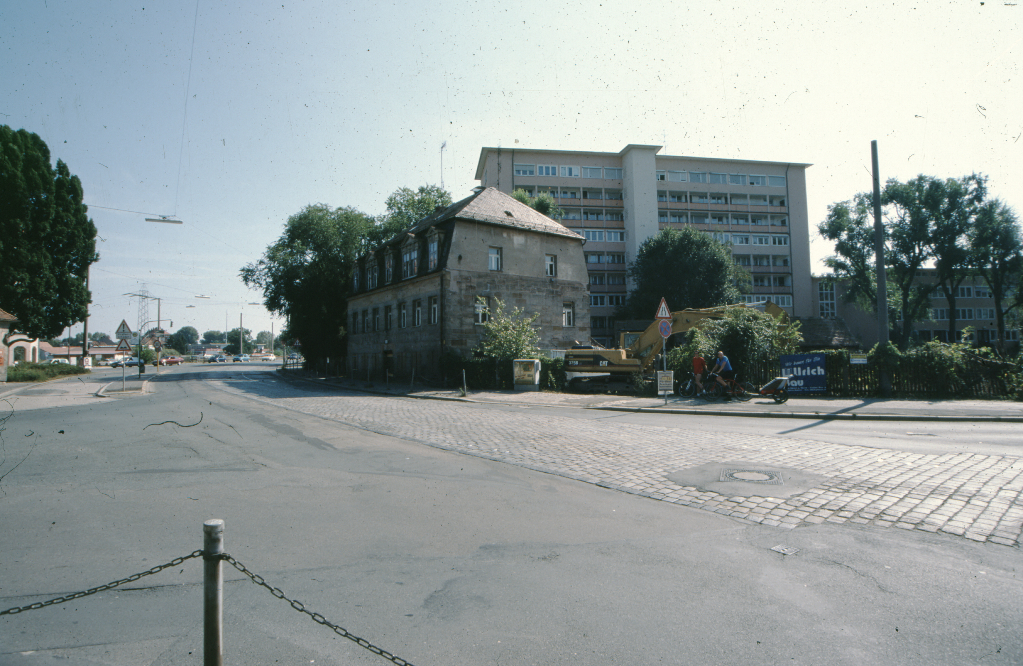 | Beschreibung | Blick von der Würzburger Straße stadteinwärts auf die Gastwirtschaft Zur Blauen Glocke. Beginn der Abrissarbeiten, 2004 | ||