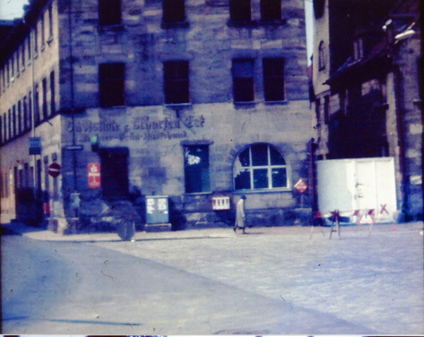 | Beschreibung | Gaststätte "Zum scharfen Eck" am Lilienplatz am ehem. Gänsberg, rechts angeschnitten der Fraveliershof. 1967 | ||