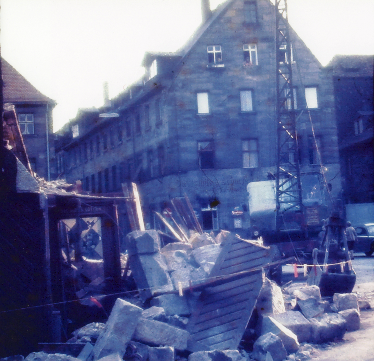 | Beschreibung | Abriss des Lotter’schen Anwesens Wasserstr. 23, 1967. Ehemaliger Eingang zur Lebküchnerei, im Hintergrund die ehem. Gaststätte "Zum scharfen Eck" | ||