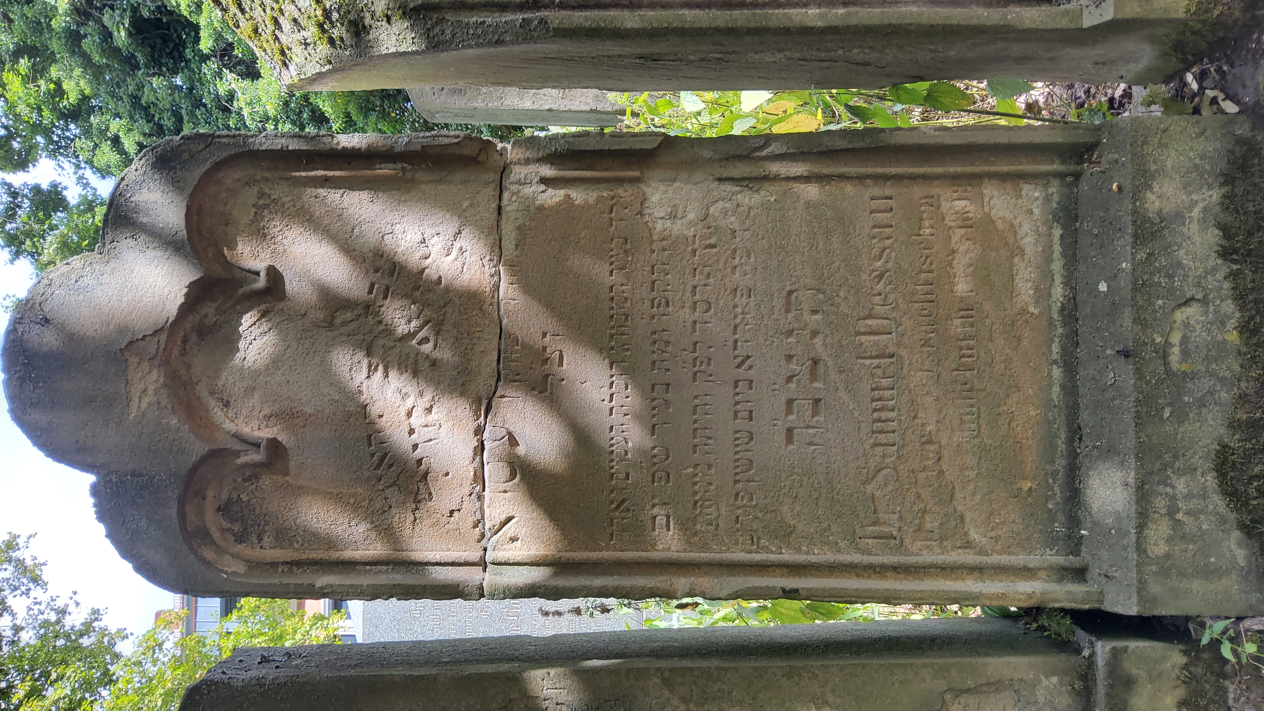 Der Name "Dessau" (דעסויא) ist genau an der Zerstörungskante links des Grabsteines und daher heute schwieriger zu lesen.