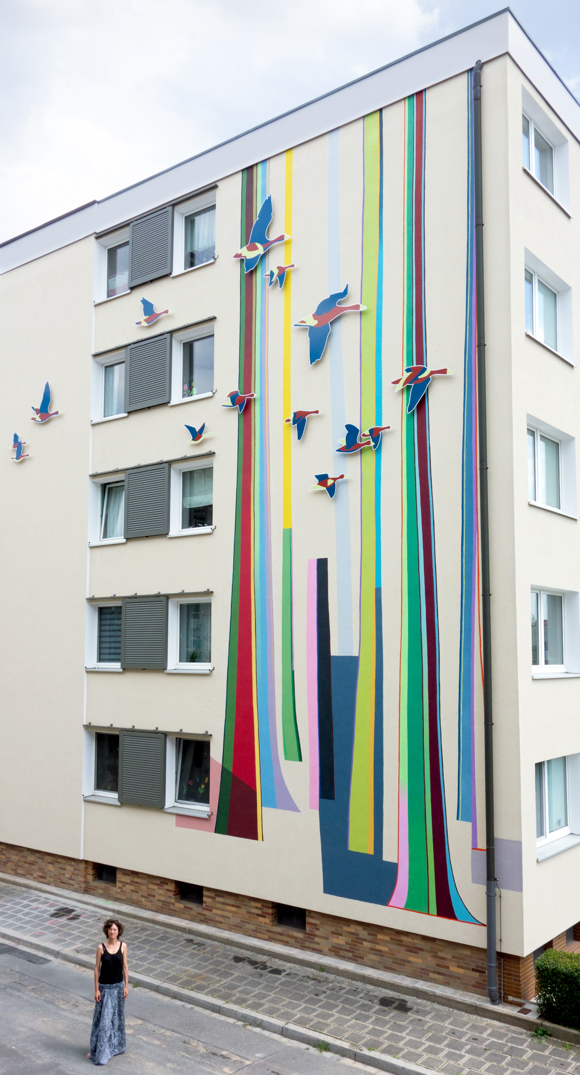 | Beschreibung | Künstlerin Sascha Banck vor dem fertigen Fassadenkunstwerk Georgenstr. 36 | ||