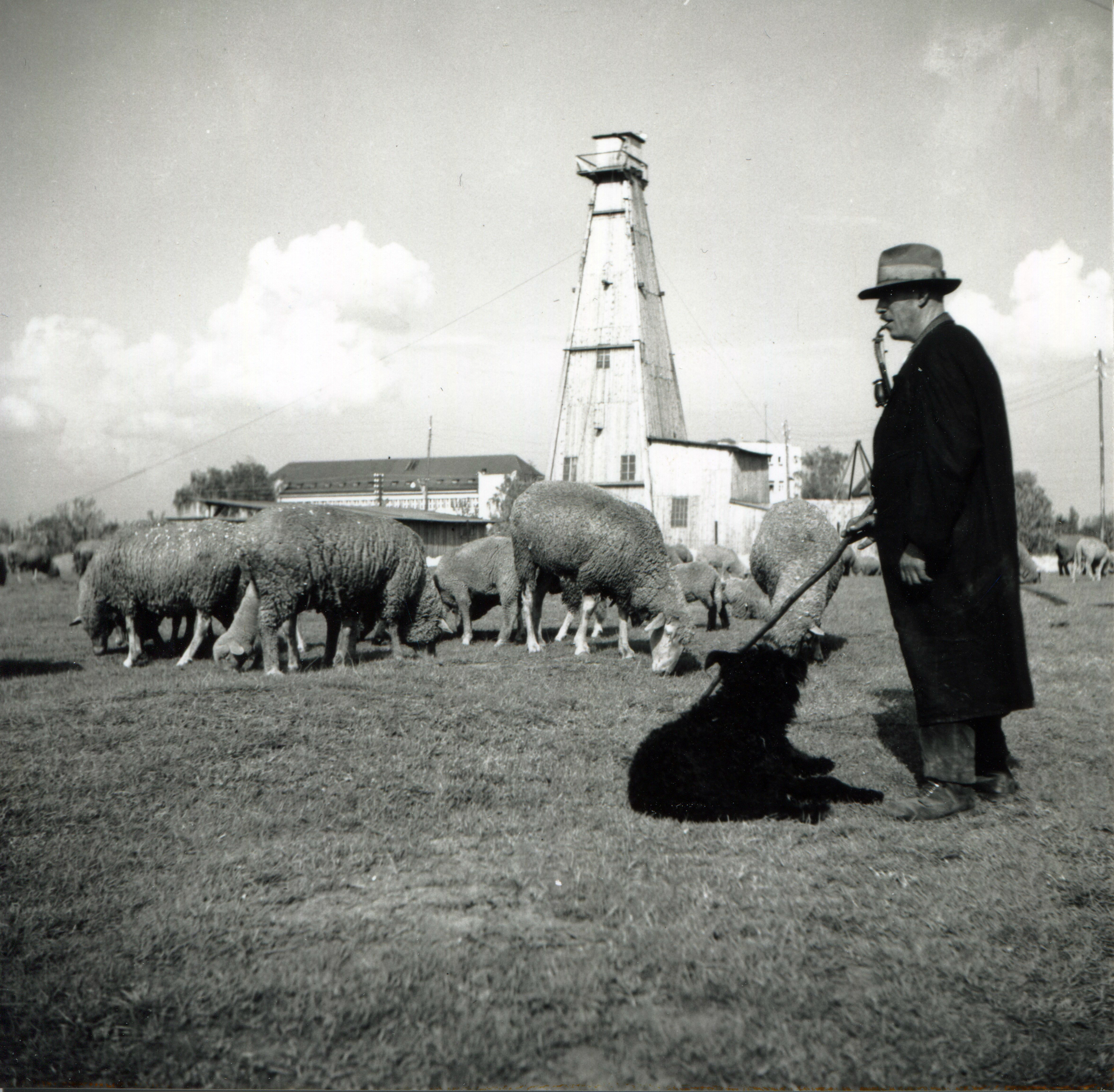 | Beschreibung | Schäfer mit seinen Schafen vor dem Bohrturm der König-Ludwig-Quelle im Espan, ca. 1935 | ||