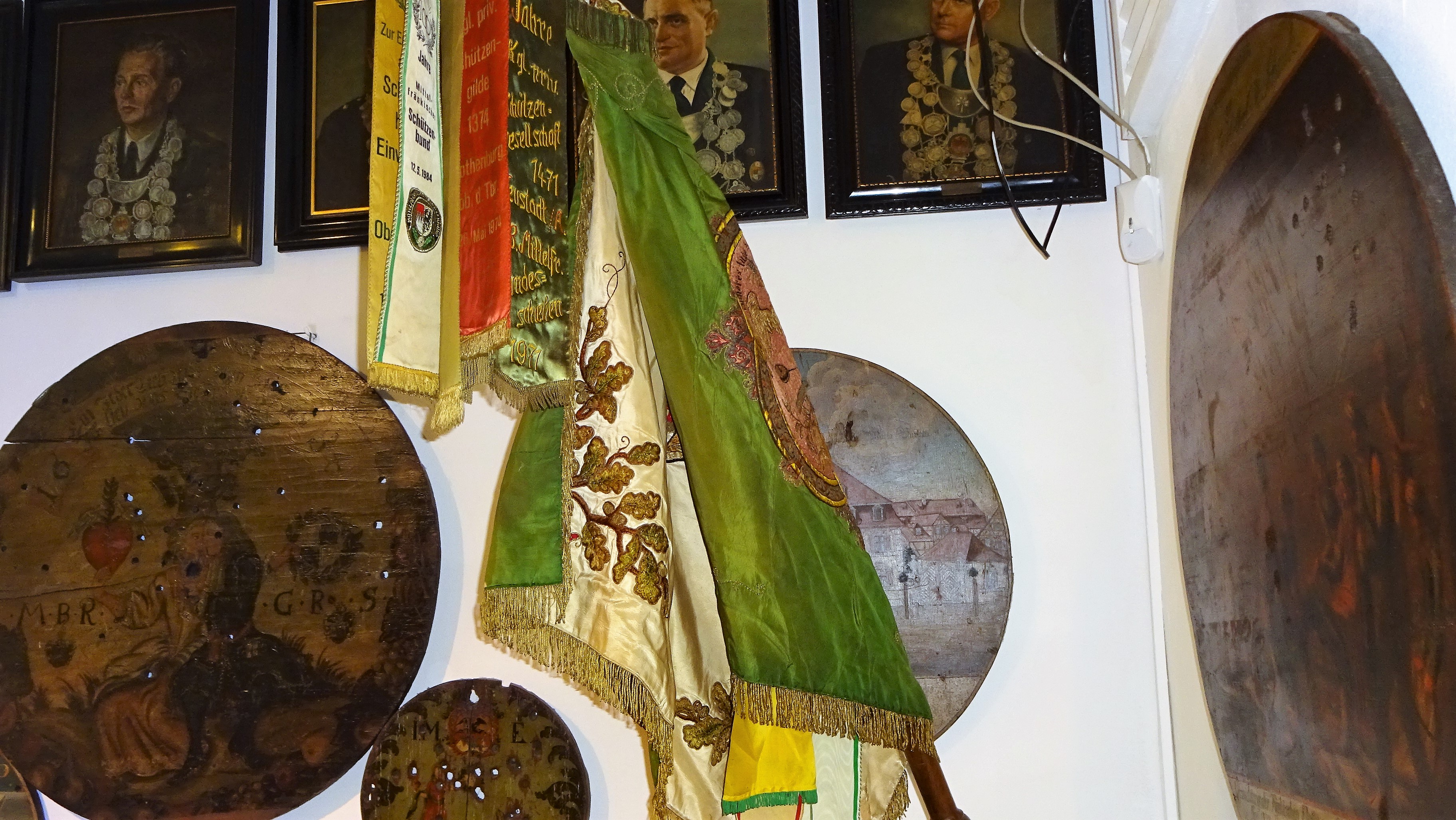 Schützen Vereinsfahne, alte Schützenscheiben und Schützenkönige im Schützenhaus
