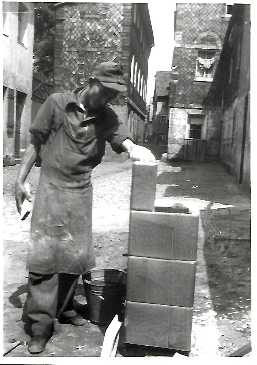 | Beschreibung | Der Ofensetzer Albert Lerch im Schützenhof, 1945 oder 1946. Im Hintergrund die Häuser Nr. 2 (links) und 3 (rechts) sowie der Durchgang zur Bergstraße | ||