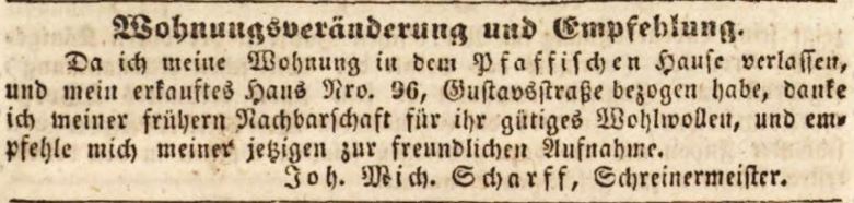 | Beschreibung | Zeitungsanzeige des Schreinermeisters Johann Michael Scharff, September 1842 | ||