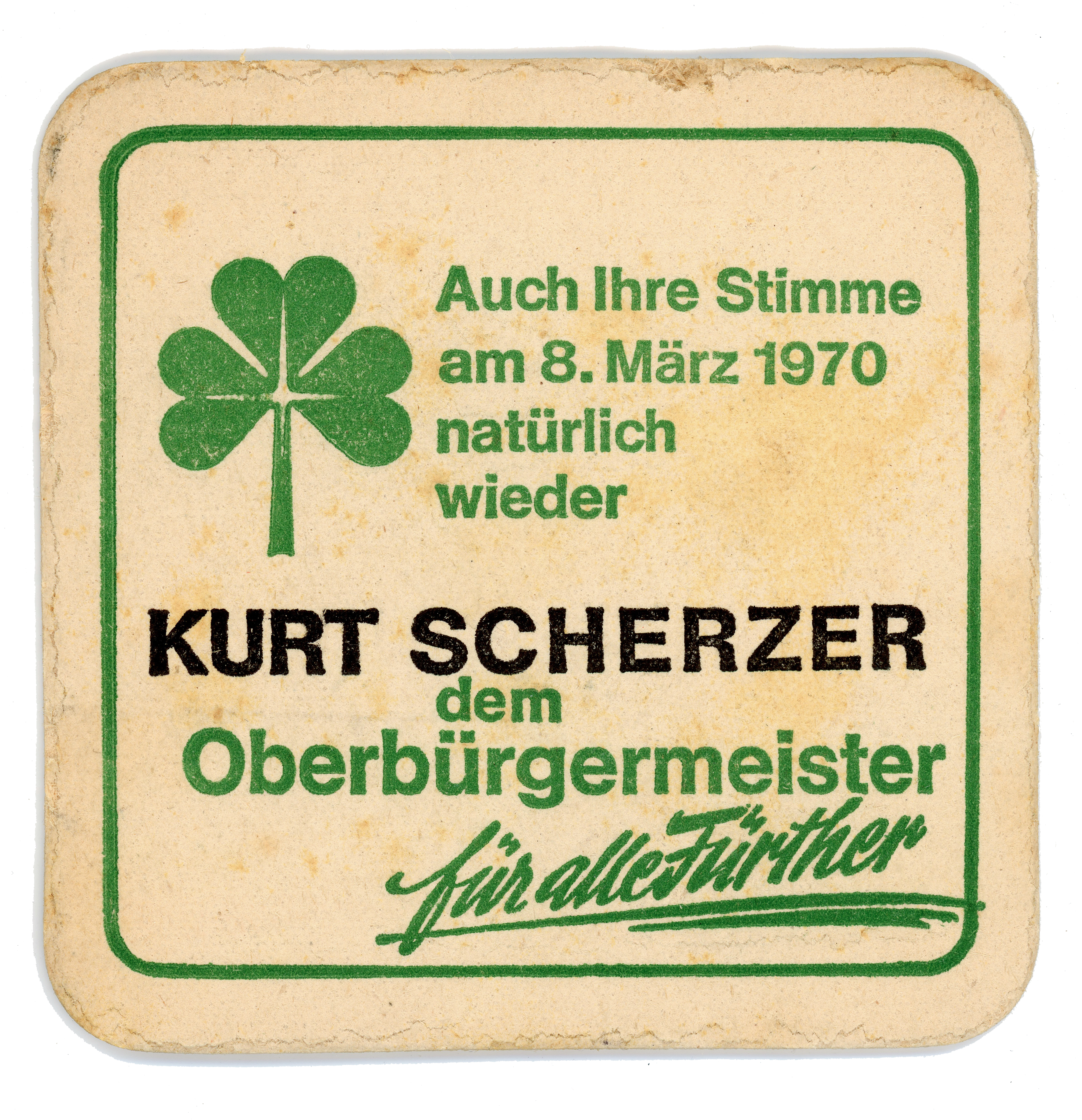 | Beschreibung | Bierdeckelwerbung für Kurt Scherzer als OB-Kandidat, 1970 | ||