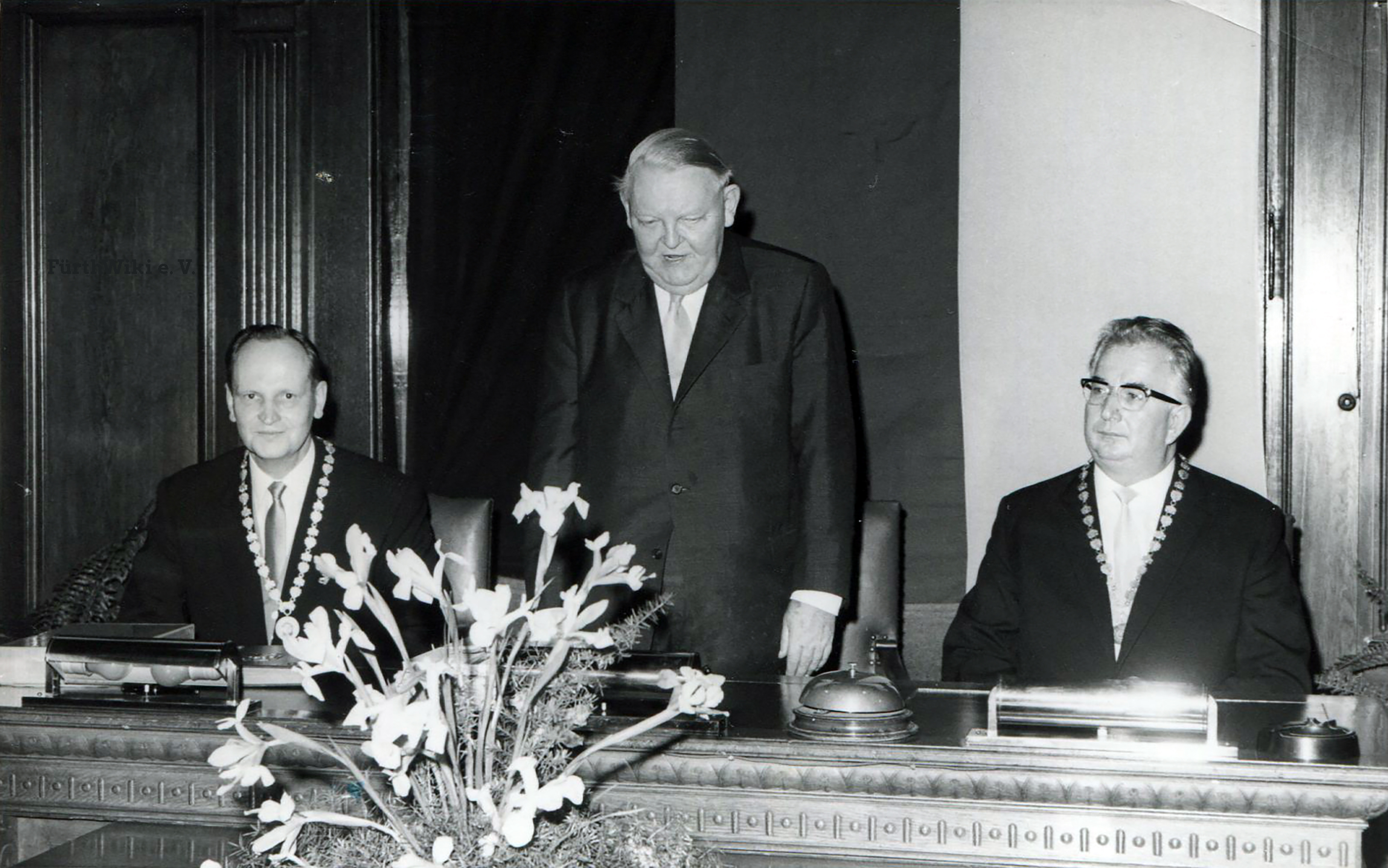 | Beschreibung | Ludwig Erhard in Fürth, hier mit Oberbürgermeister Kurt Scherzer und Bürgemeister Heinrich Stranka im Rathaus, ca. 1970 | ||