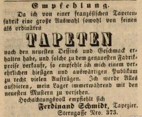 | Dateiinfo (Bild-Unterschrift und Info-Box, automatisch erstellt) | Werbeanzeige für Tapeten, Mai 1845 Lizenz: NoC-NC 1.0 | ||