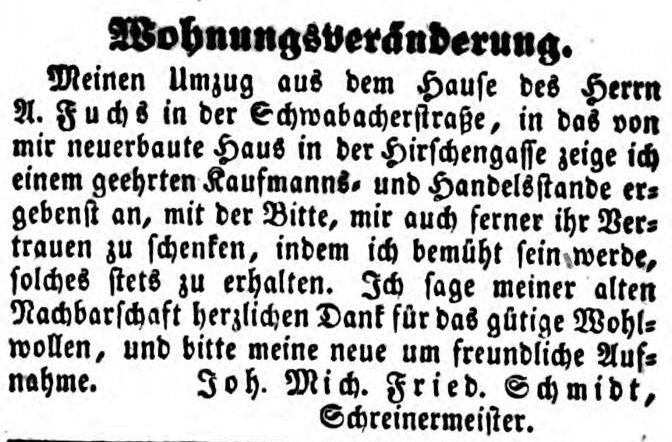 | Beschreibung | Zeitungsanzeige des Schreiners Johann Michael Friedrich Schmidt, September 1852 | ||