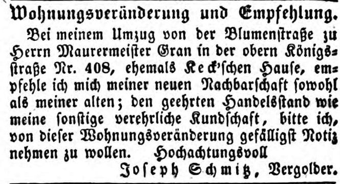 | Beschreibung | Zeitungsanzeige des Vergolders Joseph Schmitz, Mai 1852 | ||