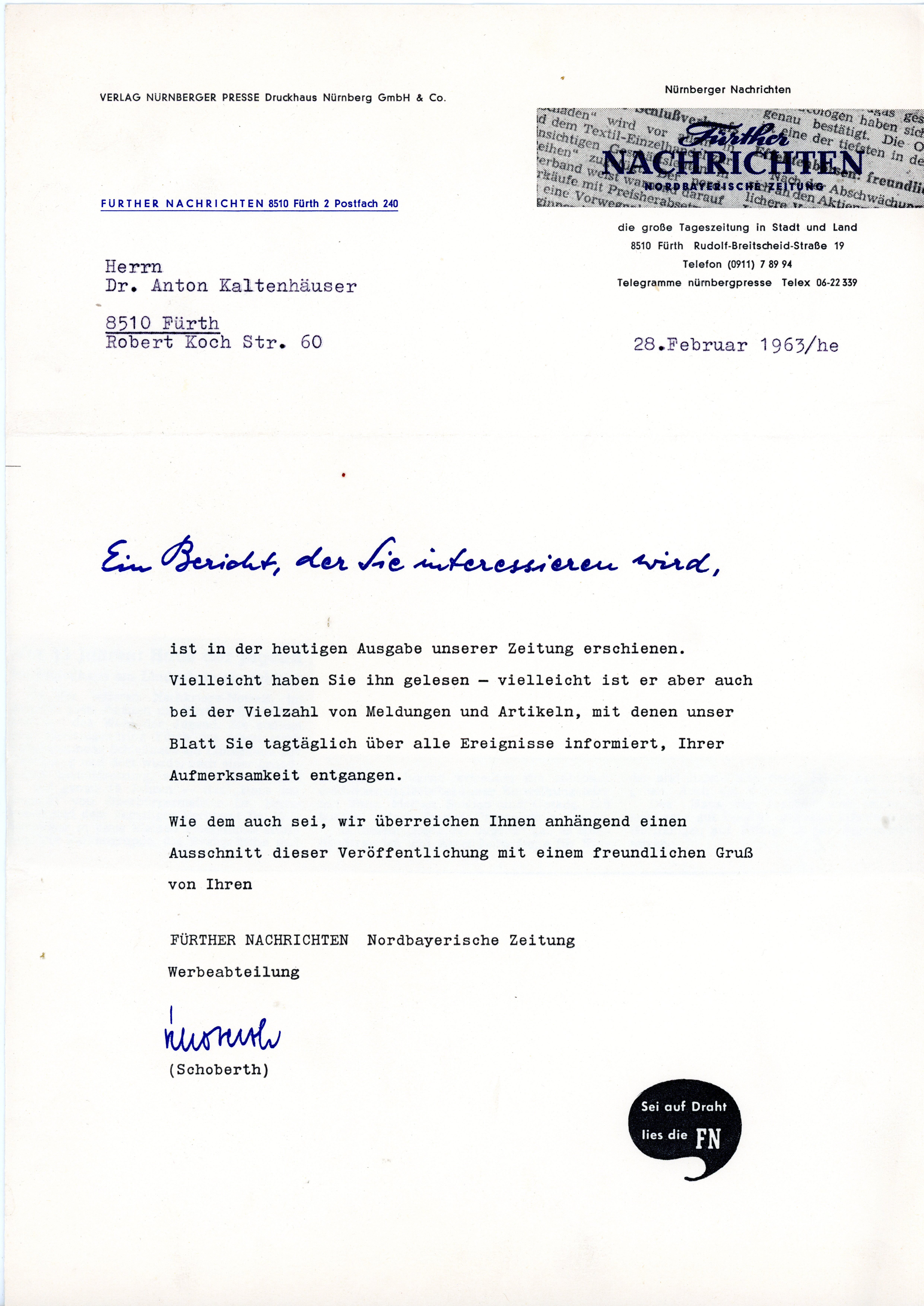 | Beschreibung | Schreiben der Fürther Nachrichten, 1963 | ||