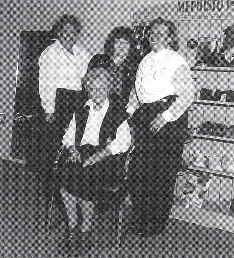 | Beschreibung | Seniorchefin Barbara Döbler mit den Töchtern Marianne Bandlow und Gertrud Baier (Clogs Juni) und langjähriger Verkäuferin, ca. 1996 | ||