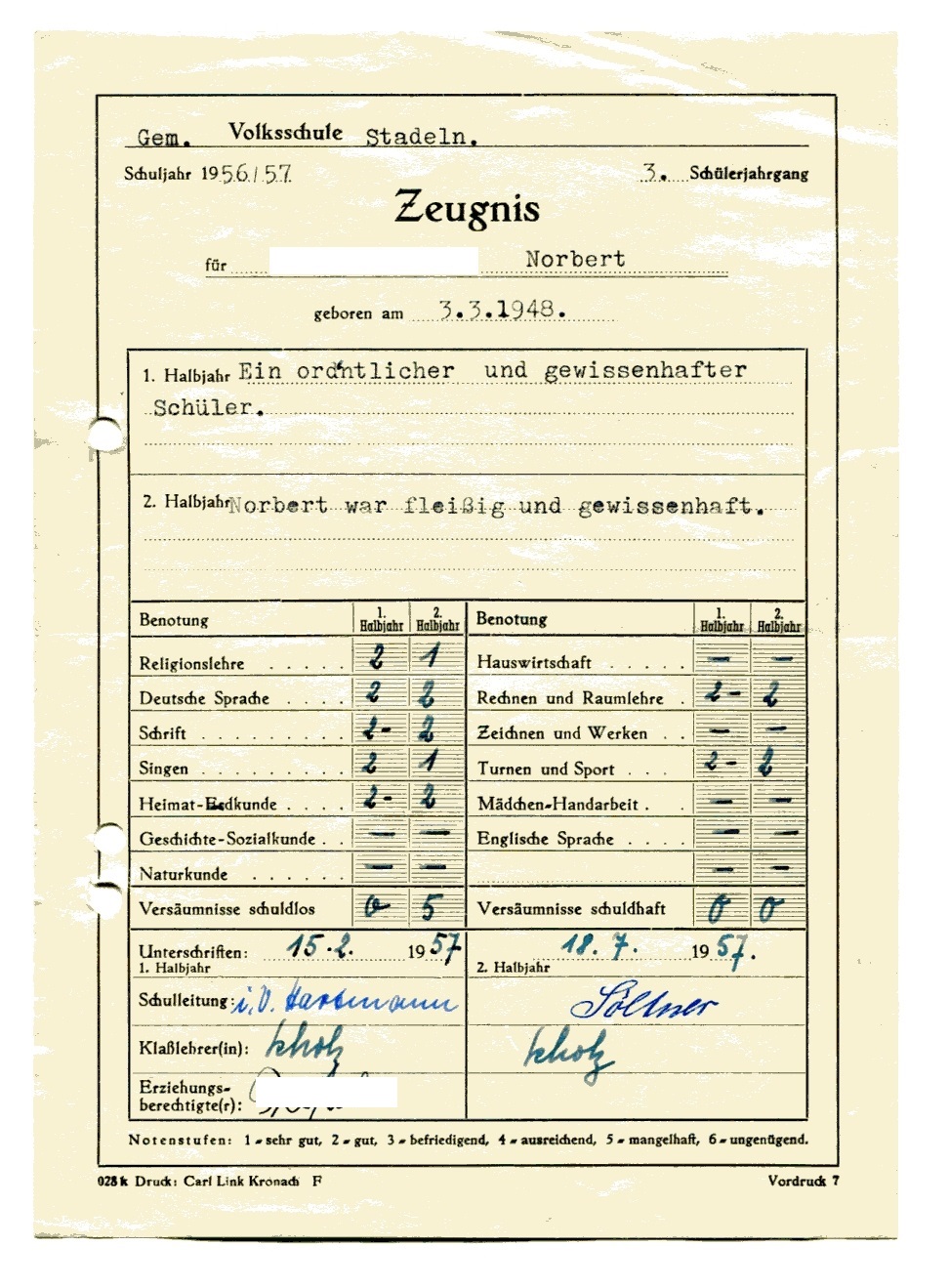 | Beschreibung | Zeugnis der 3. Klasse von 1957 der Gemeinschaftsschule Stadeln | ||