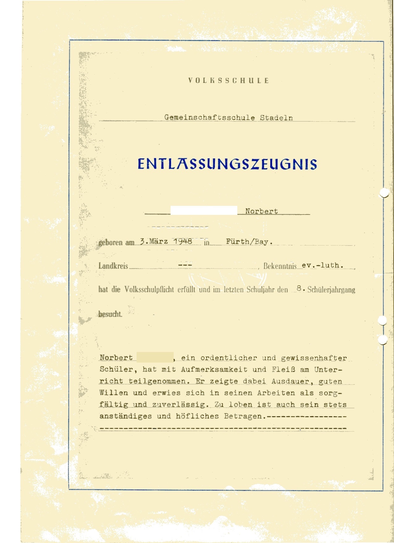 | Beschreibung | Zeugnis der 8. Klasse von 1962 der Gemeinschaftsschule Stadeln Seite 1 | ||