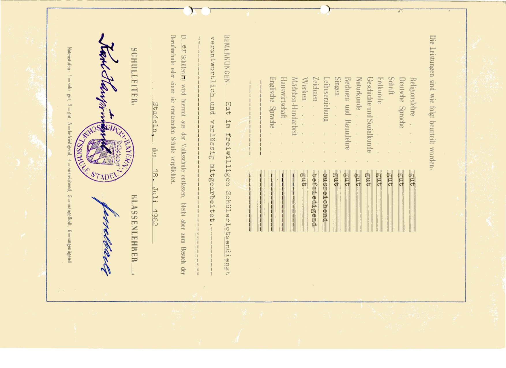 | Beschreibung | Zeugnis der 8. Klasse von 1962 der Gemeinschaftsschule Stadeln Seite 2 mit Unterschriften Rektor Hauptmannl und Oberlehrer Hesselbach. | ||