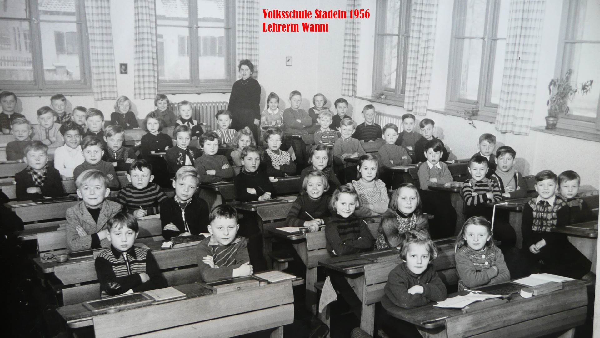 Klassenfoto der 2. Klasse 1956 mit Lehrerin Wanni. Im Hintergrund der noch bestehende Kindergarten.