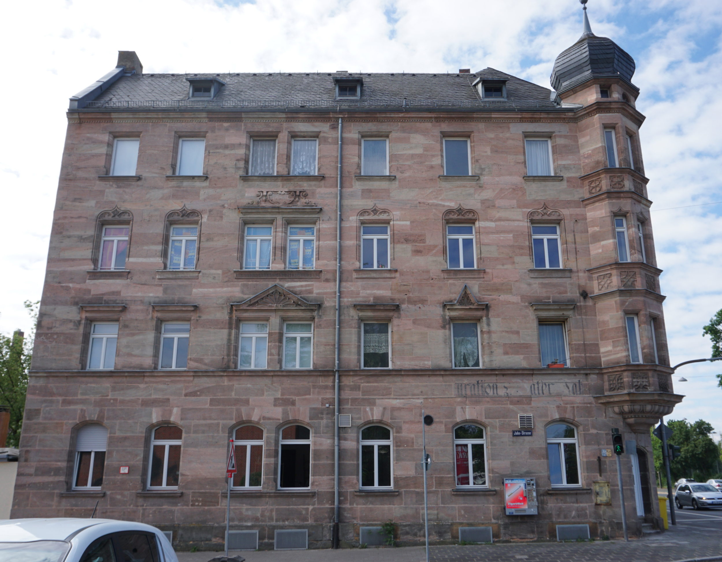 BeschreibungMietshaus mit (ehem.) Gaststätte Schwabacher Straße 199 (Straßenfront Jahnstraße), Mai 2020