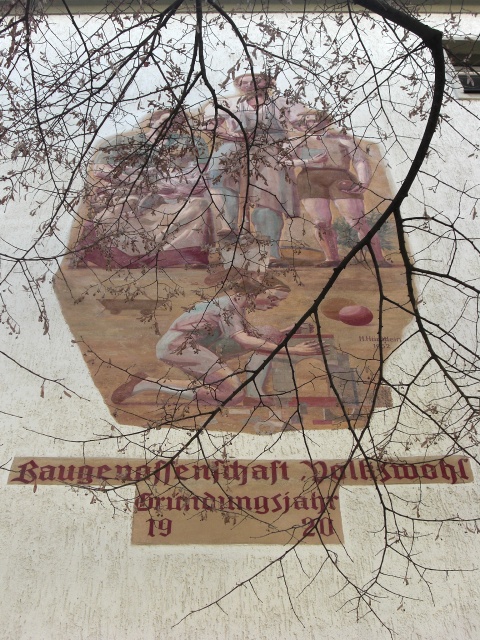 | Beschreibung | Wandmalerei "Familie", Baugenossenschaft Volkswohl, Gründungsjahr 1920. Nach fotografischer Erfassung wurde das Bild im Sommer 2011 mit Wärmedämmplatten überzogen. | ||