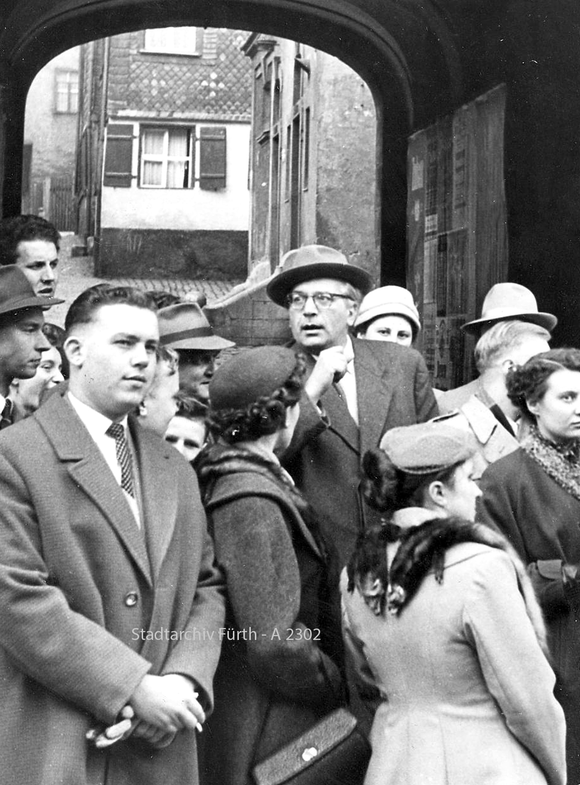 | Beschreibung | Dr. Schwammberger (mit Brille und Hut) bei einer Führung durch die Altstadt am Durchgang des Geleitshauses, ca. 1960 | ||
