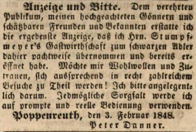 | Beschreibung | Zeitungsannonce des Wirts zum schwarzen Adler (Poppenreuth) Peter Danner, Februar 1848 | ||