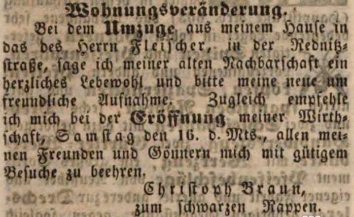 | Beschreibung | Werbeanzeige von Christoph Braun für das Lokal zum schwarzen Rappen, Mai 1846 | ||