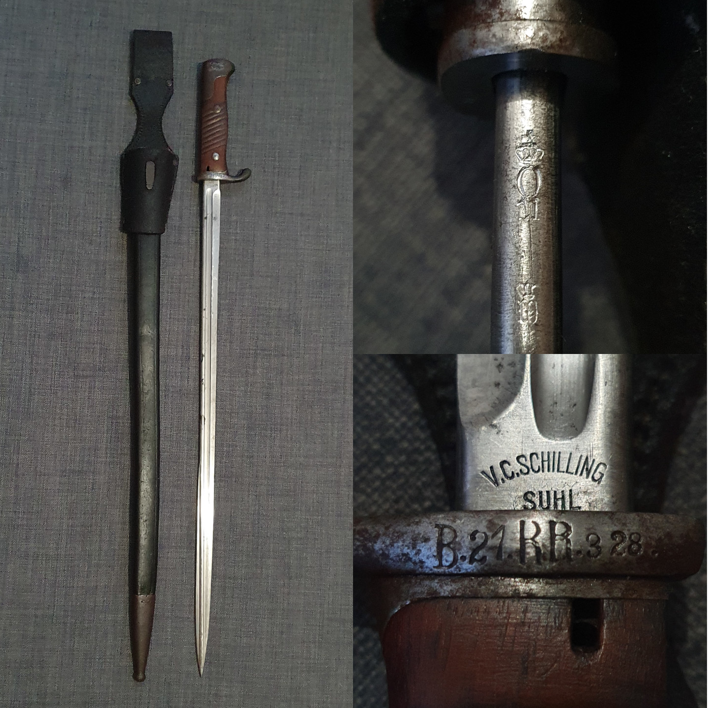 | Beschreibung | Seitengewehr SG 84/98 (Bajonette) Nr. 328 des Königlich Bayerischen 21. Reserve-Infanterie-Regiments (Truppenstempel, Bild rechts unten), das 1911 von der bayerischen Heeresverwaltung unter König Otto von Bayern für den Truppengebrauch übernommen wurde (Ärarischer Stempel, Bild rechts oben). | ||
